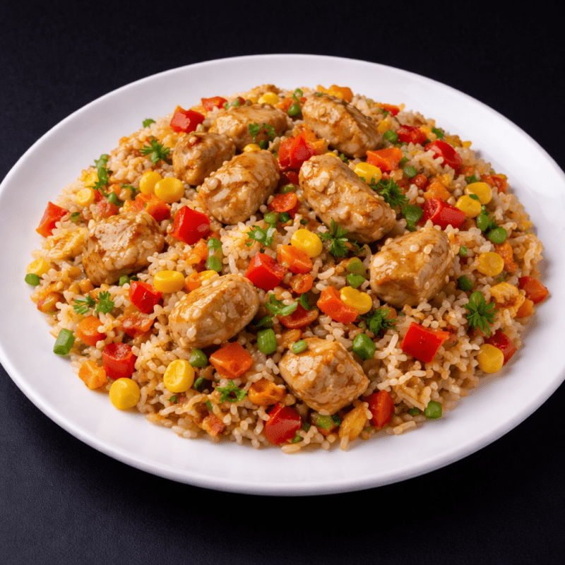 Куриное филе, болгарский перец, морковь, лук репчатый, чеснок, устричный соус, рис, яйцо куриное, кукуруза