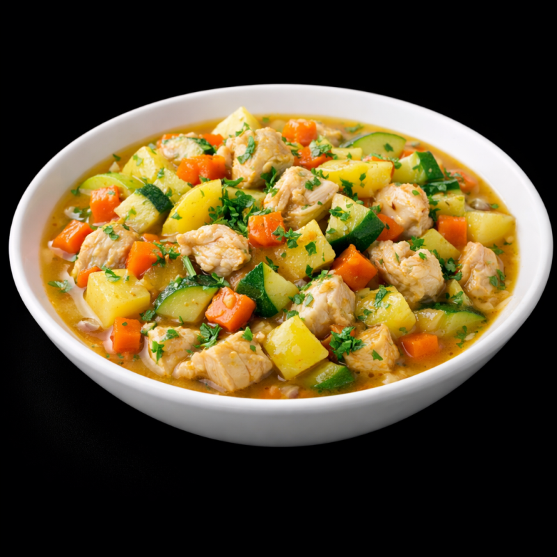 Овощное рагу с куриным филе, картофелем, кабачками и зеленью