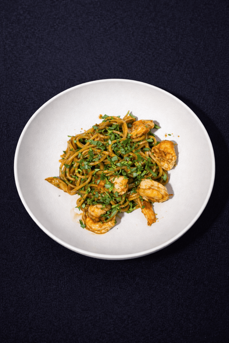 Спагетти, тигровые креветки, филе кальмара, устричный соус, чеснок, пармезан, зелень